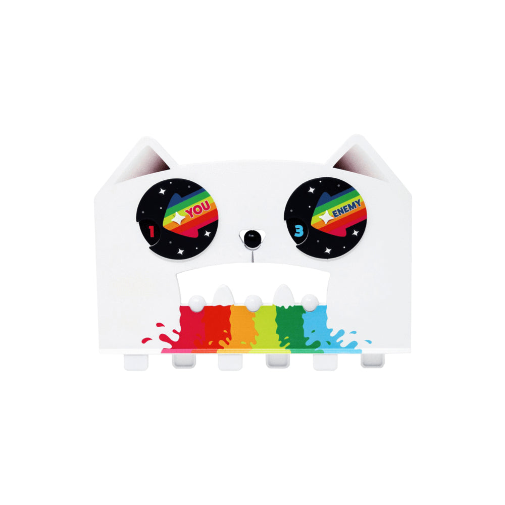 In a round, you use your cat's paw to shoot balls through the cat's mouth at your opponent, or you aim for the nose and teeth to knock them out. As soon as all the balls of one color — the one black ball, the three white balls, or the eight yellow balls — are on one side of the board, the round ends and the other player scores a point. Reset the board, and start shooting at one another once again!