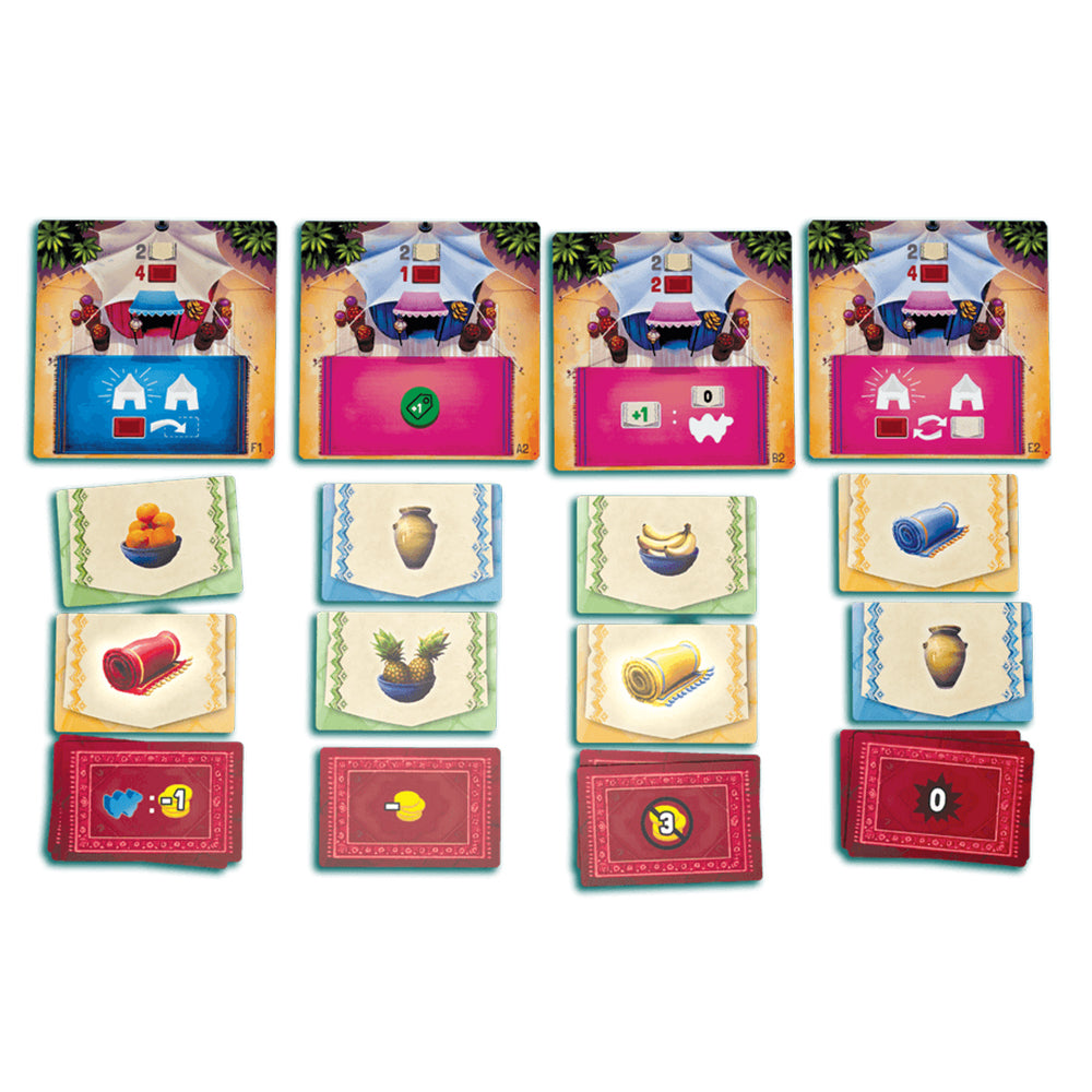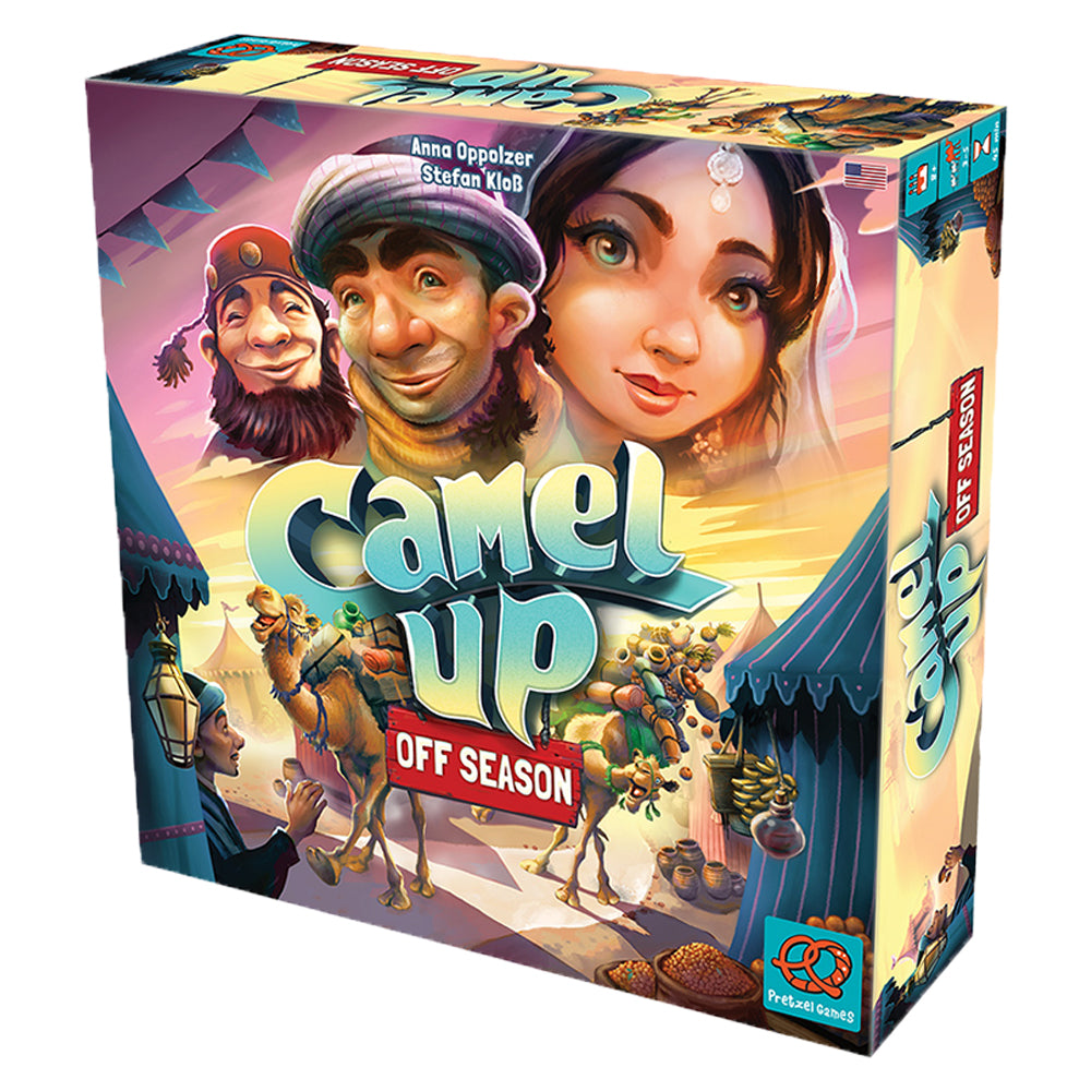 In Camel Up: Off Season, each of the 3-5 players has their own caravan of four camels that can carry goods, with the camels being able to carry 3, 4, 5, and 6 goods. Goods come in four types — carpets, vases, dates, and (non-date) fruit — and these goods will be available at markets, with one more market in play than the number of players. Each double-sided market indicates how many face-up and face-down cards are placed there, in addition to the special power of that market.