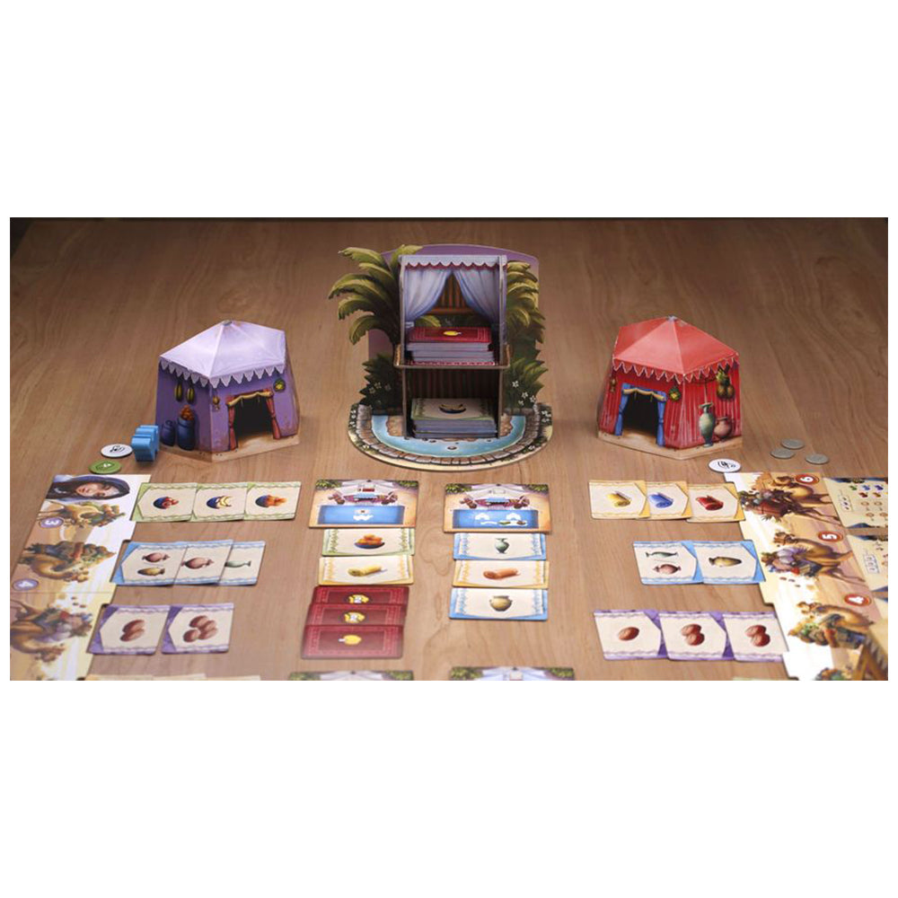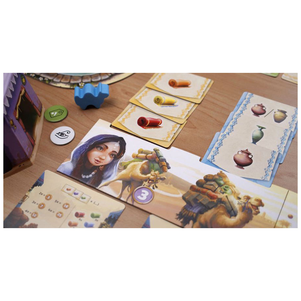 The winning bidder chooses a market, uses the power of that market (if they wish), then takes all of the goods from that market, flips them face up (if needed), then loads the goods on their camels. A camel can hold goods of only one type, and if a goods type is on a camel, then you must continue placing that good on the same camel. Each camel has a goods limit, however, and if you exceed that limit, then you must throw away all of that type of good.