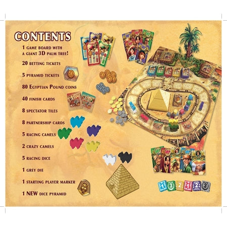 In Camel Up, up to eight players bet on five racing camels, trying to suss out which will place first and second in a quick race around a pyramid. The earlier you place your bet, the more you can win — should you guess correctly, of course. Camels don't run neatly, however, sometimes landing on top of another one and being carried toward the finish line. Who's going to run when? That all depends on how the dice come out of the pyramid dice shaker, which releases one die at a time when players pause from their bets long enough to see who's actually moving!