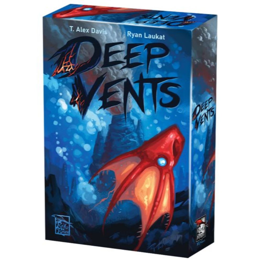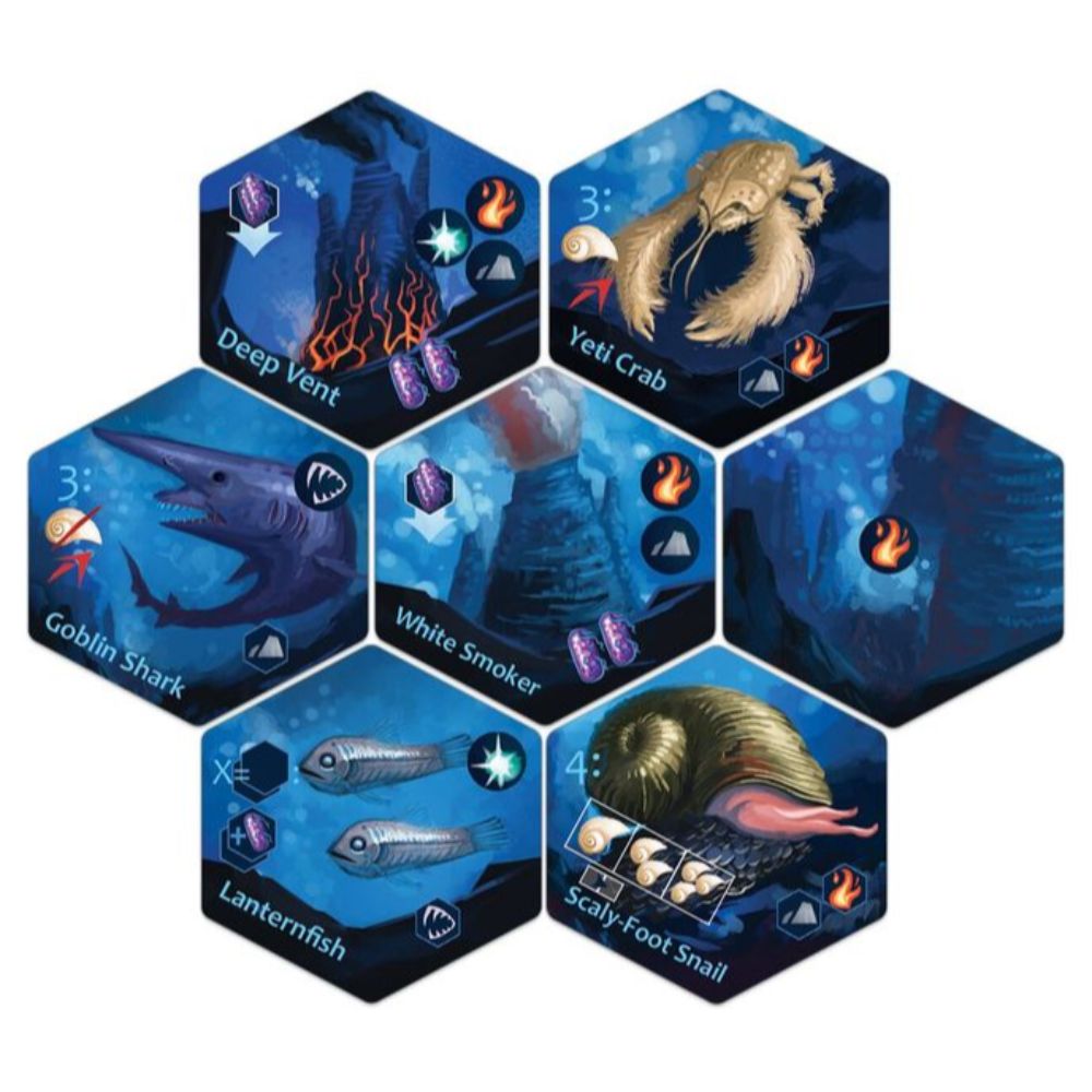 In Deep Vents, players compete to create the most efficient and powerful hydrothermal ecosystem. Each turn, draft and place a tile in your system, then choose to grow or trigger each tile — gaining resources, attacking others, or unleashing devastating effects that can wipe entire parts of the ecosystem.