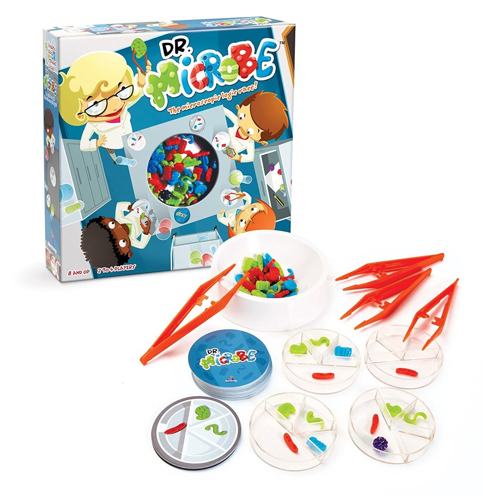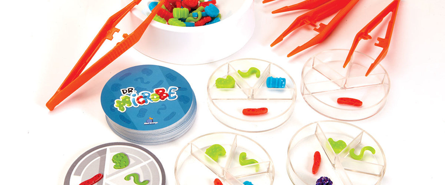 In each round of Dr. Microbe, you're presented with a challenge card that shows some combination of microbes and (possibly) a superbug. Each player has tweezers and a petri dish that's divided into three small sections and one large one. As soon as the card is revealed, players must race to place the microbes (and superbug, if present) in their petri dish. What's more, they must figure out which microbes (and possibly the superbug) to place in their petri dish based on this rule: The superbug must always be a different shape and color than the other three microbes in your dish! Whoever fills their dish with the proper items first claims the challenge card, and whoever first grabs five cards wins the game!