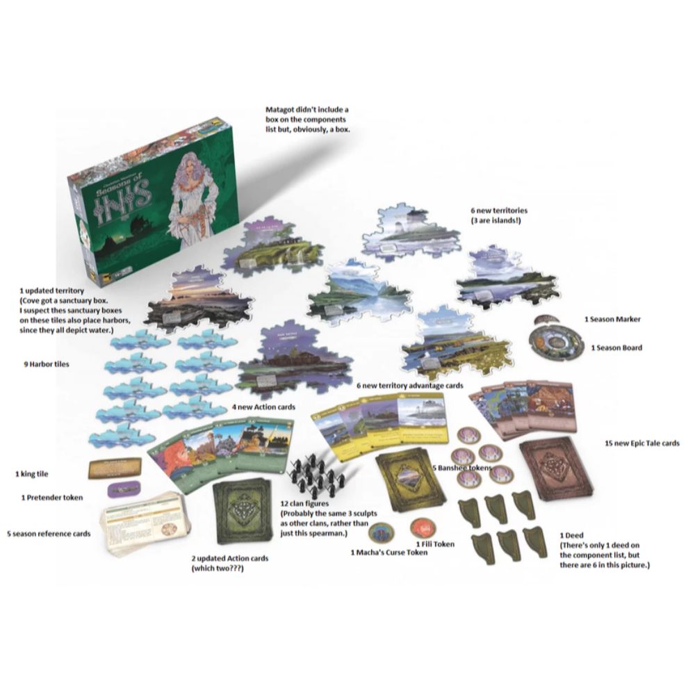 Inis welcomes a fifth player in the Seasons of Inis expansion! Discover new gameplay with the seasons wheel, bringing new modalities of victory! Explore the six new territories and lead your troops from the harbors to the island! This expansion offers new action cards. Go back to the adventure, warrior, and may the gods be on your side!