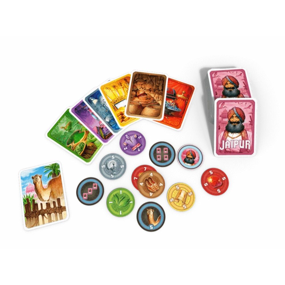 You are one of the two most powerful traders in the city of Jaipur, the capital of Rajasthan, but that's not enough for you because only the merchant with two "seals of excellence" will have the privilege of being invited to the Maharaja's court. You are therefore going to have to do better than your direct competitor by buying, exchanging, and selling at better prices, all while keeping an eye on both your camel herds. Jaipur is a fast-paced card game, a blend of tactics, risk and luck. On your turn, you can either take or sell cards. If you take cards, you have to choose between taking all the camels, taking one card from the market, or swapping 2-5 cards between the market and your cards. If you sell cards, you get to sell only one type of good, and you receive as many chips for that good as the number of cards you sold. The chips' values decrease as the game progresses, so you'd better hurry! On the other hand, you receive increasingly high rewards for selling three, four, or five cards of the same good at a time, so you'd better wait! You can't sell camels, but they're paramount for trading and they're also worth a little something at the end of the round, enough sometimes to secure the win, so you have to use them smartly.