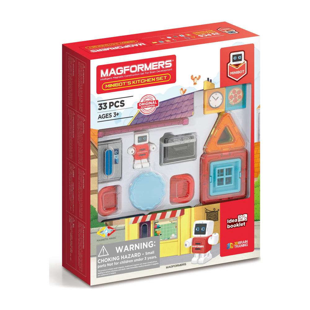 Minibot is the world’s hardest-working chef. Every day he builds his very own kitchen to whatever design takes his fancy – then cooks up a delicious meal for his friends in his little oven. With 18 Magformers magnetic shapes and 14 special accessories this is a fun creative construction toy, also containing a cute robot chef figure. Each day this busy bot designs a brand new kitchen layout using Magformers magnetic construction squares and triangles plus chairs, a table, fridge, oven with sliding drawer, windows and other fun accessories. And with Minibot’s Kitchen Set making changes is always as easy as pie – you just smash it down and start again – because with Magformers magnetic construction it never takes long to build a new design. This 33-piece set is compatible with any other Magformers set but is specifically designed to combine with the three other sets in the 2019 miniworld series – Milo the dog, Max the boy and Maggy the girl. And when joined together all four sets mak a series of mega mansions for the friends to live in and play happily. Minibot just loves to entertain.
