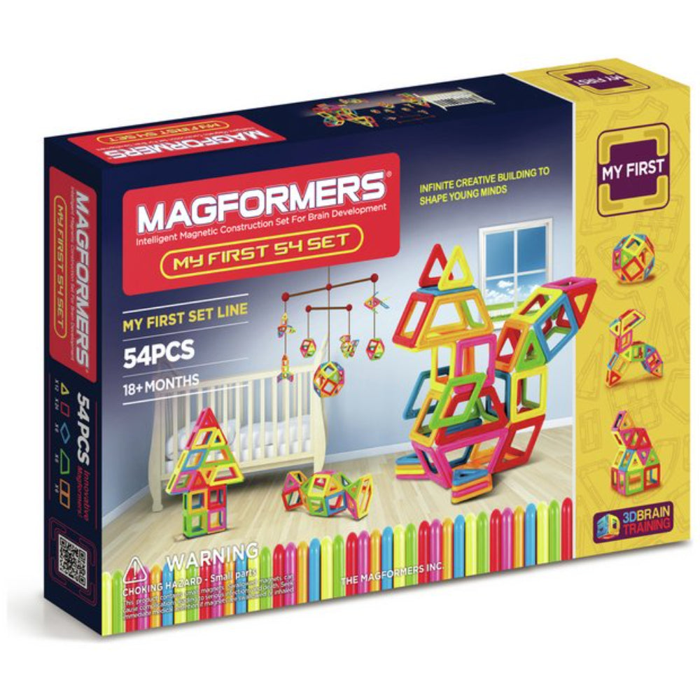 Creative minds are sure to love the endless possibilities of the My First 54Pc Set. With 5 different geometric shapes in 6 colors children can follow along with 29 play cards to learn about color, match shapes, learn the names of fruit and animals and click Magformers together to create both 2D and 3D patterns. The possibilities are endless. Features: Certified for children under three and is perfectly safe for children of all ages. Comes in a handy storage box which closes like a book and has special compartments to keep the set pieces together. Includes a colourful themed model booklet with construction ideas. Includes double-sided cards with construction options. Suggests ideas for comparing colours and shapes My First Magformers series is the first Magformers construction set for 3-D brain development 5 Geometric Shapes. Compatible with all MAGFORMERS® shapes and accessories. Neodymium Rare-Earth Magnets for guaranteed connectivity. BPA Free HQABS Plastic.