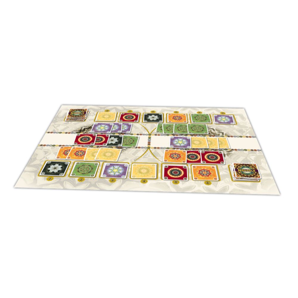 In the two-player game Mandala, you are trying to score more than your opponent by collecting valuable cards - but you won't know which cards are valuable until well into the game! Over the course of the game, players play their colored cards into the two mandalas, building the central shared mountains and laying cards into their own fields. As soon as a mandala has all six colors, the players take turns choosing the colors in the mountain and adding those cards to their "river" and "cup". At the end of the game, the cards in your cup are worth points based on the position of their colors in that player's river. The player whose cup is worth more points wins.