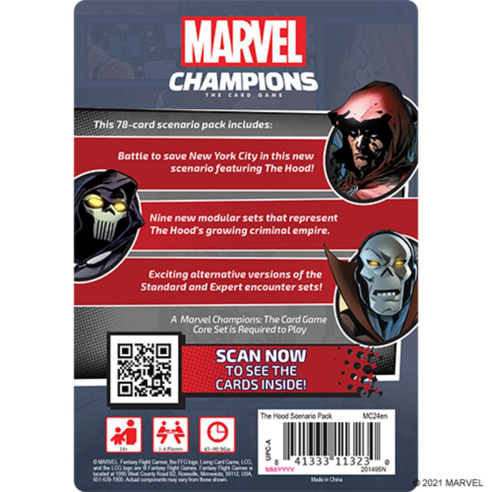 This expansion adds a compelling new scenario filled with escalating tension and modular challenges. With nine brand-new encounter sets, The Hood Scenario Pack brings more variety and danger to every game. Combine these sets with other villains for endless combinations—or challenge The Hood himself across his three escalating stages.