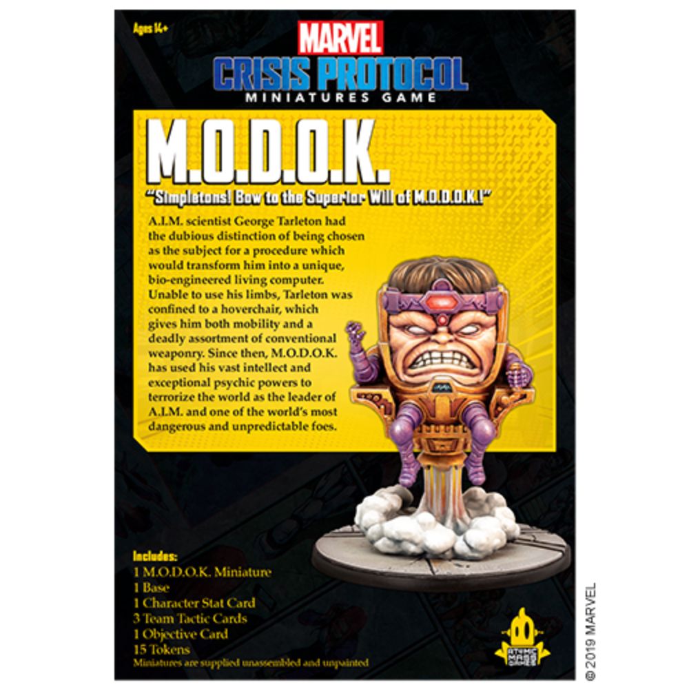 The box contains everything players need to add M.O.D.O.K. to their Marvel: Crisis Protocol collections. Miniatures are supplied unassembled and unpainted.