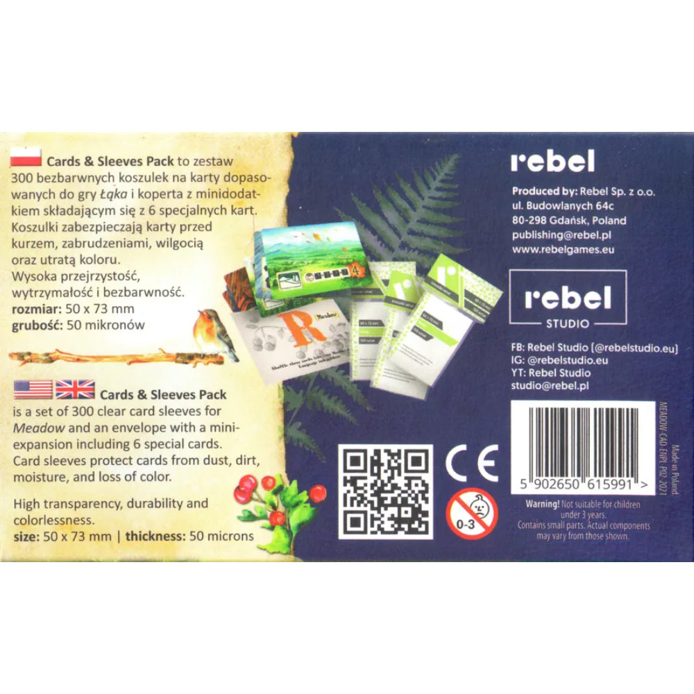 Take care of your Meadow and protect it with special card sleeves! The set includes 300 transparent sleeves in Meadow cards size, providing protection from dirt, moisture and loss of colour. Additionally, there is an envelope with 6 cards as a mini-expansion to the game!