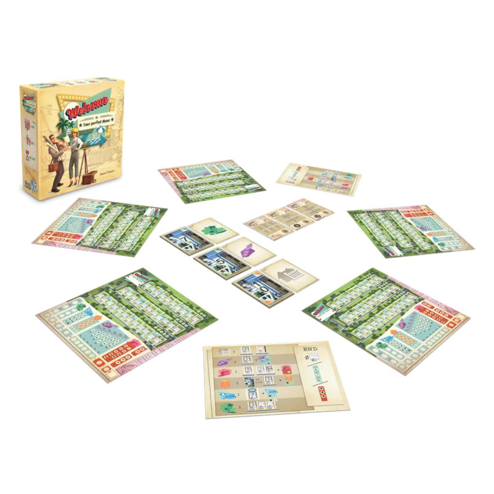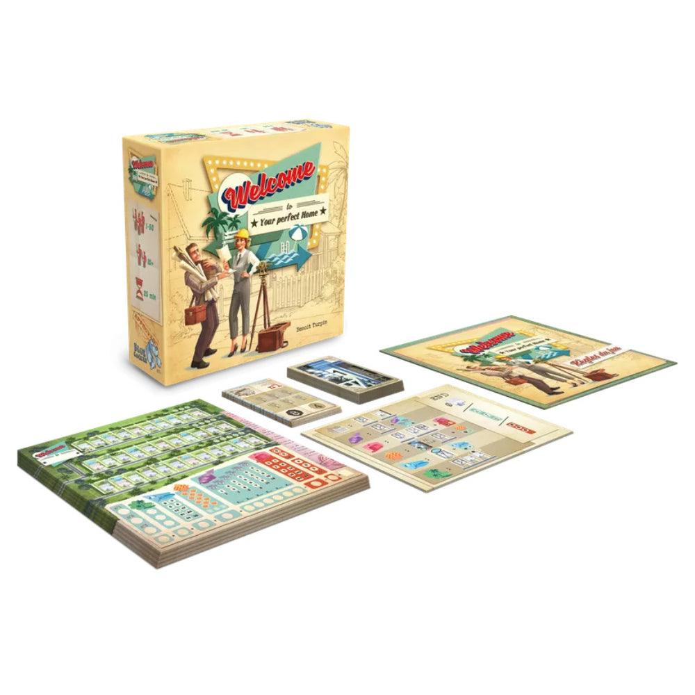 Welcome To... plays like a roll-and-write dice game in which you mark results on a score-sheet...but without dice. Instead you flip cards from three piles to make three different action sets with both a house number and a corresponding action from which everyone chooses one. You use the number to fill in a house on your street in numerical order. Then you take the action to increase the point value of estates you build or score points at the end for building parks and pools. Players also have the option of taking actions to alter or duplicate their house numbers. And everyone is racing to be the first to complete public goals. There's lots to do and many paths to becoming the best suburban architect in Welcome To...!